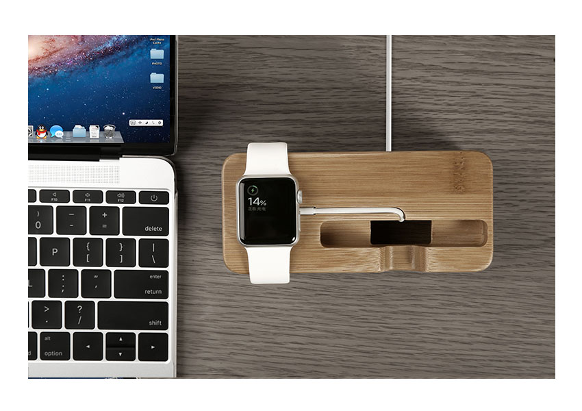 Genuine natural wood docking station for iPhone 6 and Apple Watch 38mm 42mm. Special cutout for the Apple Watch charger and cable, non-slip base and no-scratch padding hold your Apple devices in place on desk or table top. A great place to keep your Apple Watch clean and safe while charging.